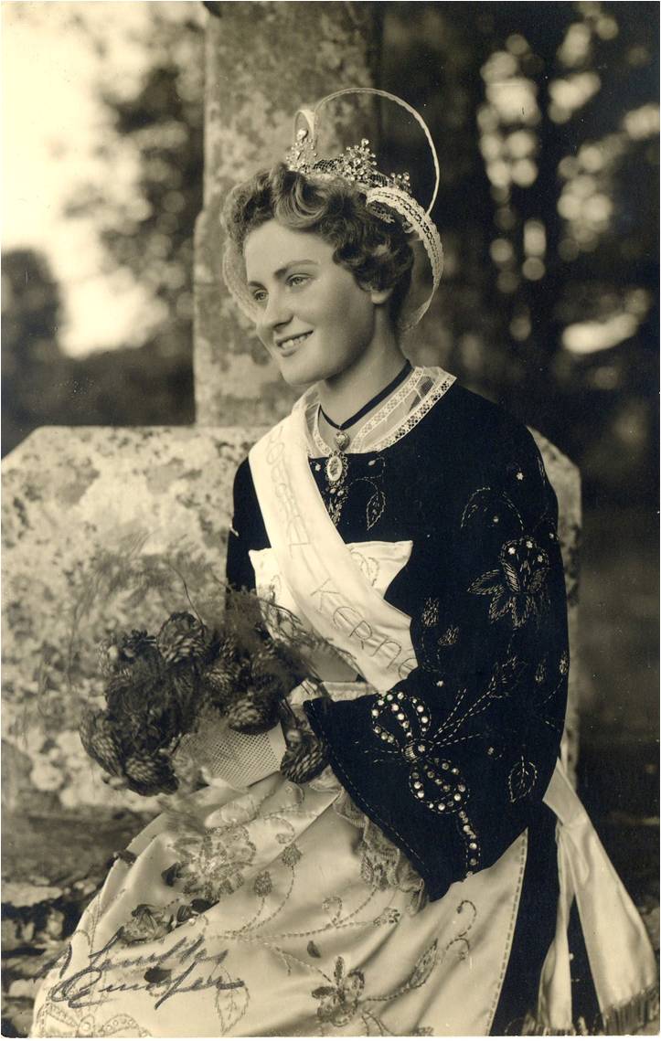 Catherine ETES, présentée par le tout jeune cercle celtique Roz Aon, est élue reine de Cornouaille lors des "grandes fêtes de Cornouailles" à Quimper, le 27 juillet 1958.