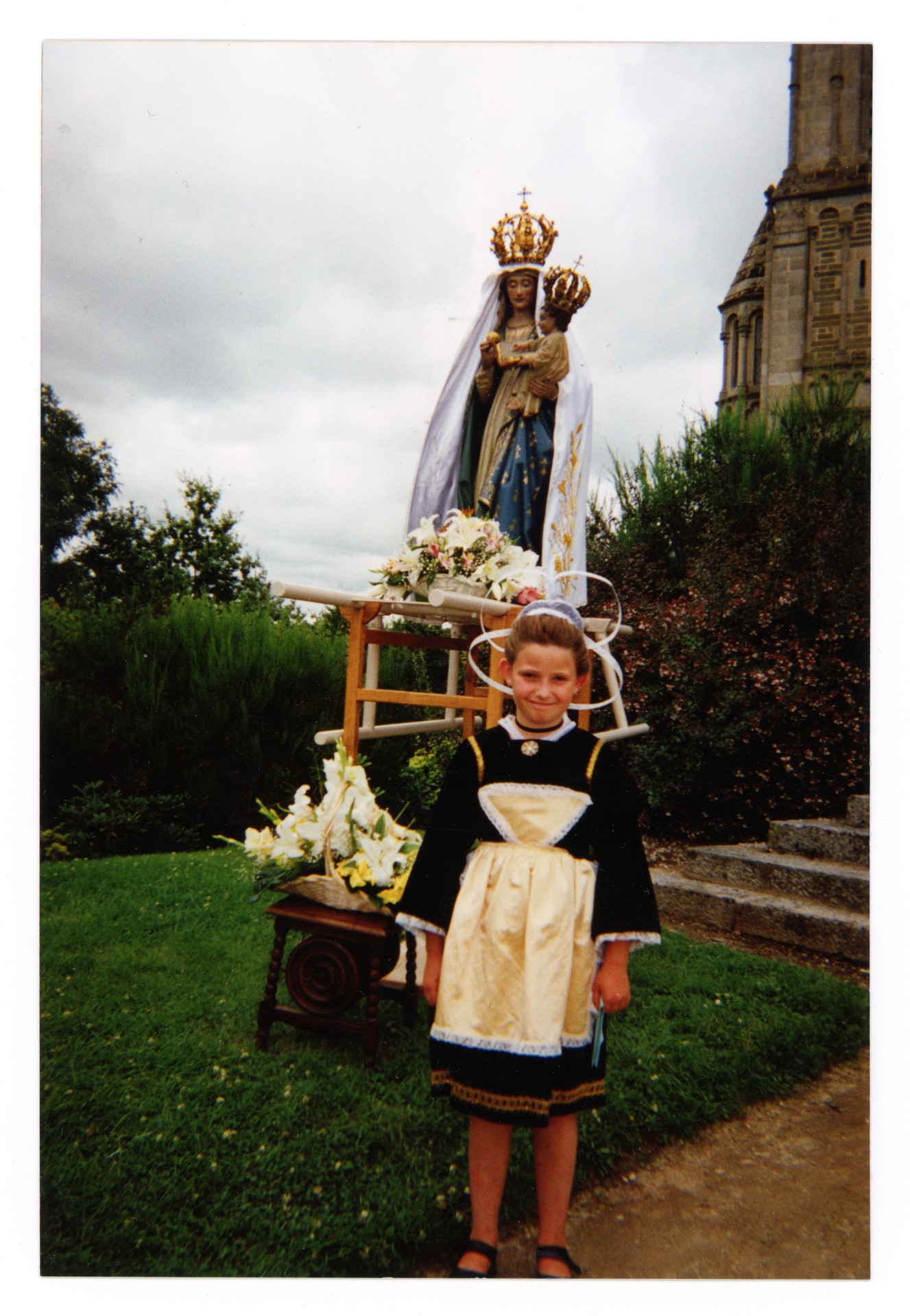 A l'occasion du pardon, Enora porte la coiffe et le costume Dardoup, qui avait été confectionné en 1965 pour sa maman Lenaig qui participait aux fêtes du Bleun Brug