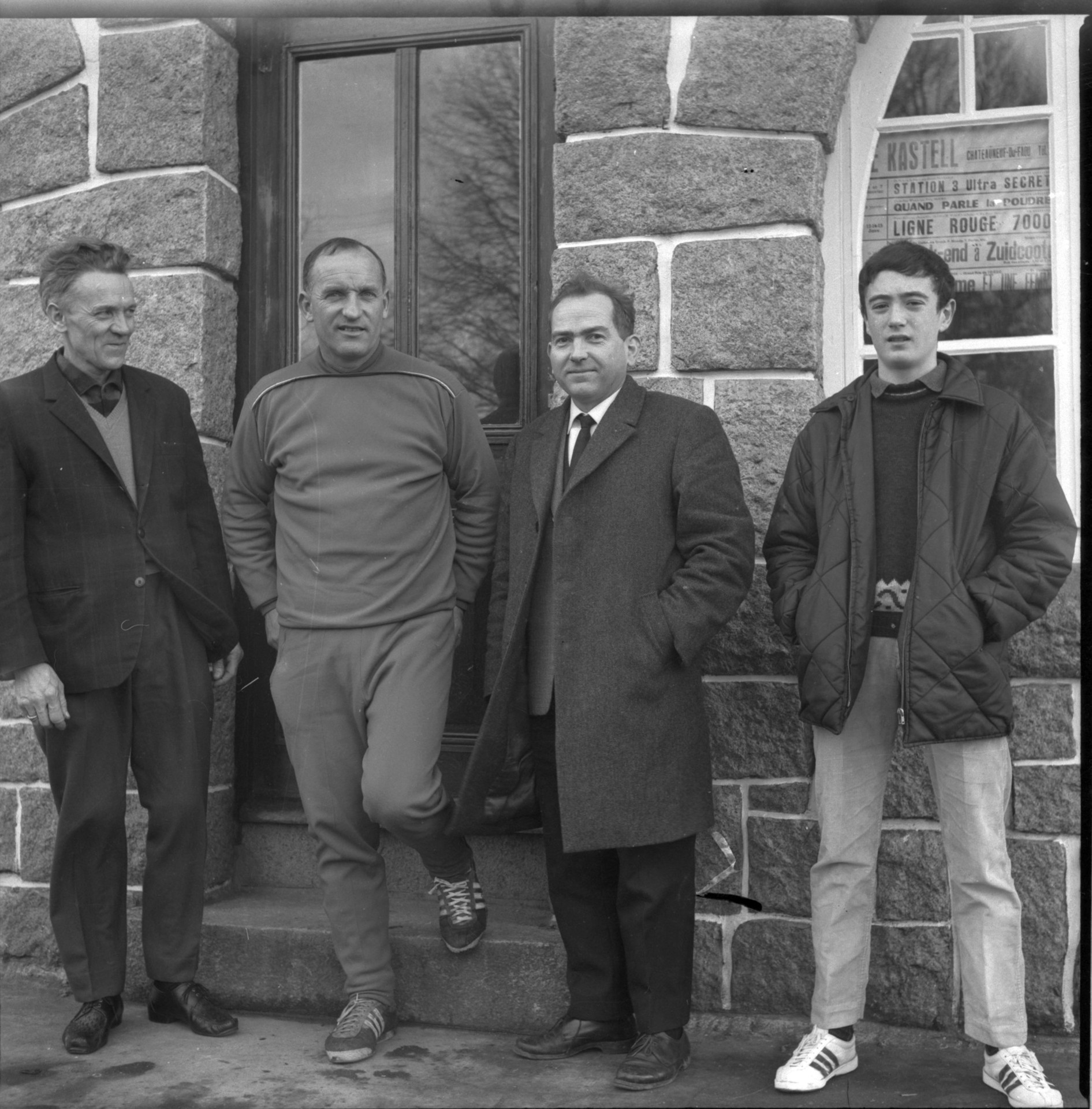 Se retrouvent à poser devant l'auberge du saumon à Paimpol : Marcel Floc'h, M. Guérin, Georges Le Meur et Jacques Levenez, fils de Marcel Levenez, correspondant OF, qui prend la photo.
