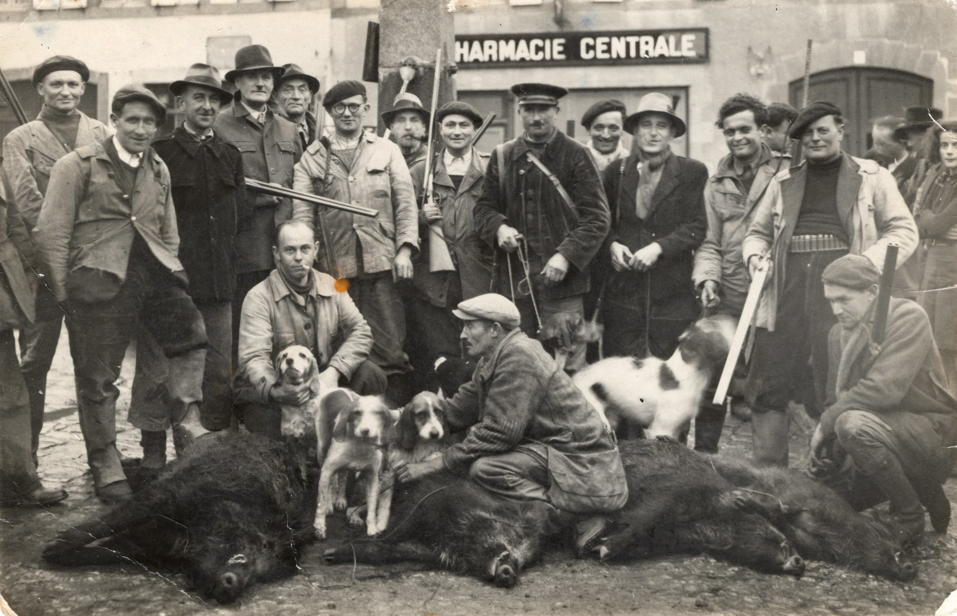 Beau tableau de chasse que ces sangliers exposés, morts, devant la fontaine, au centre de Châteauneuf. Les chasseurs, comme les chiens de chasse, sont fiers de l'exploit !