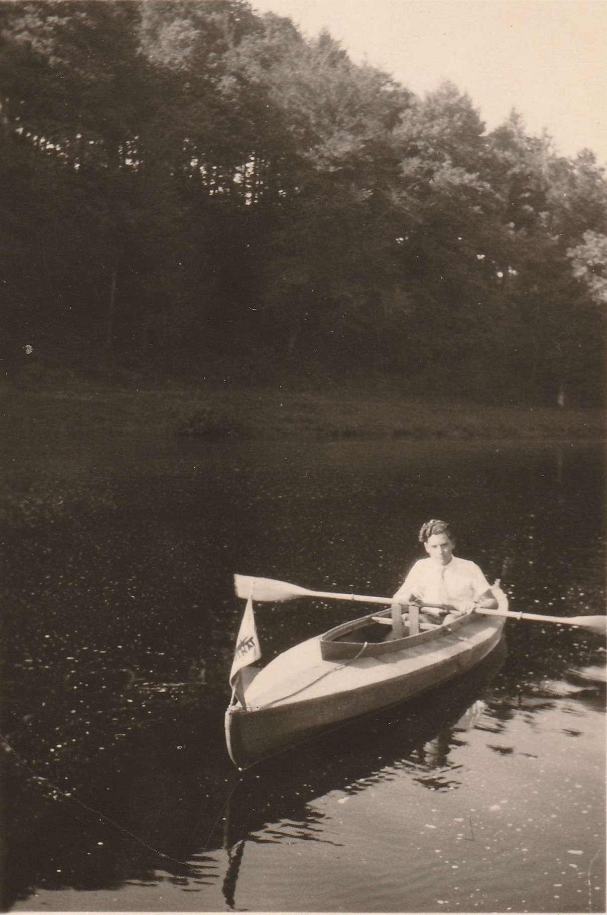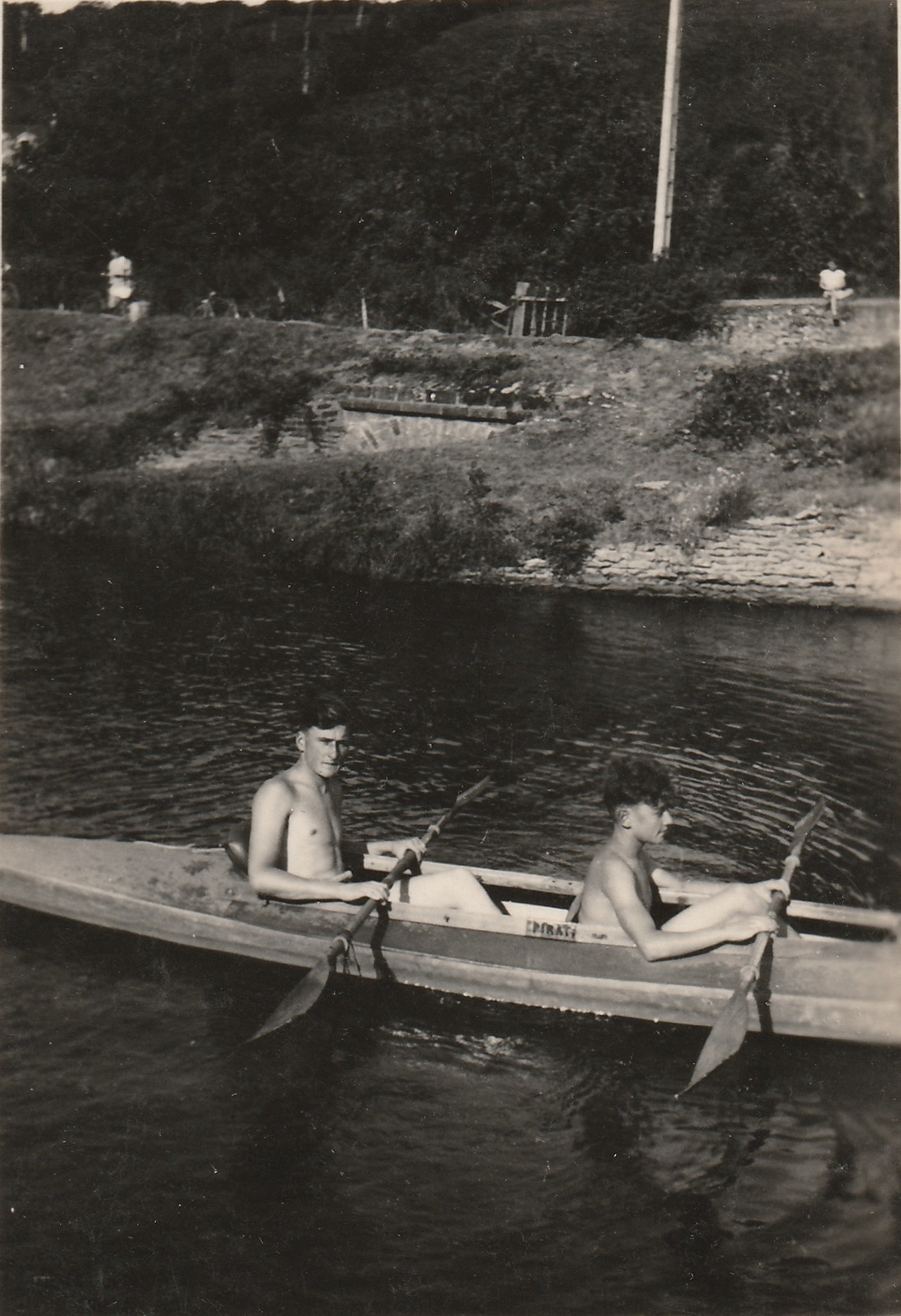 Une sortie kayak à Bizernig pour ces jeunes châteauneuviens privilégiés. On reconnait Georges LE MEUR et Jacques BERTHELEME. Attention au déversoir !