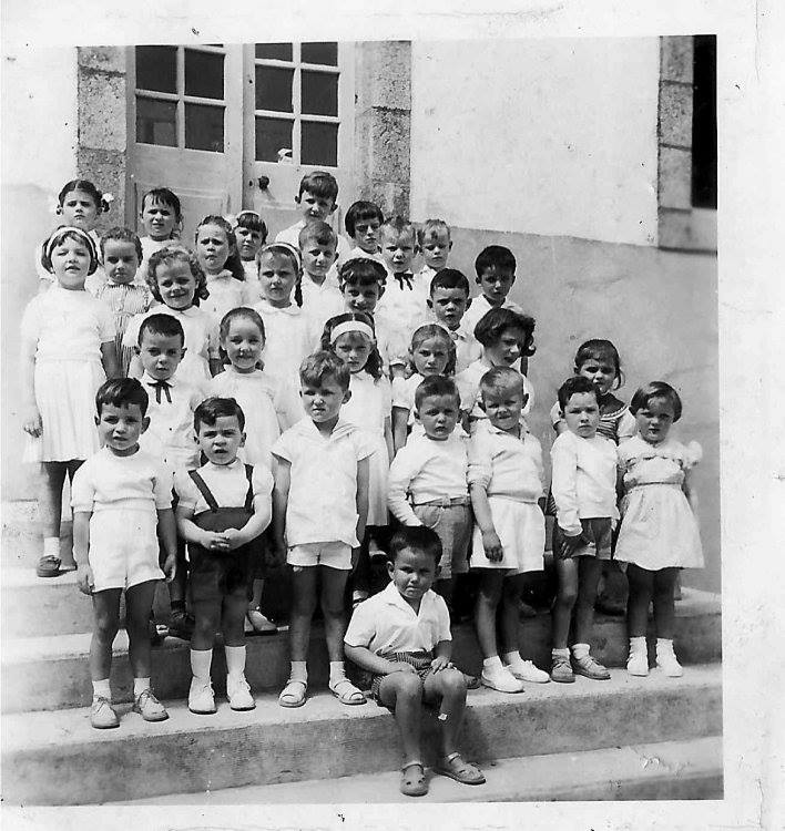 Printemps 1957 : la classe maternelle pose sur le perron. Les enfants ont ôté la blouse. Il s'agit sûrement d'un grand jour.