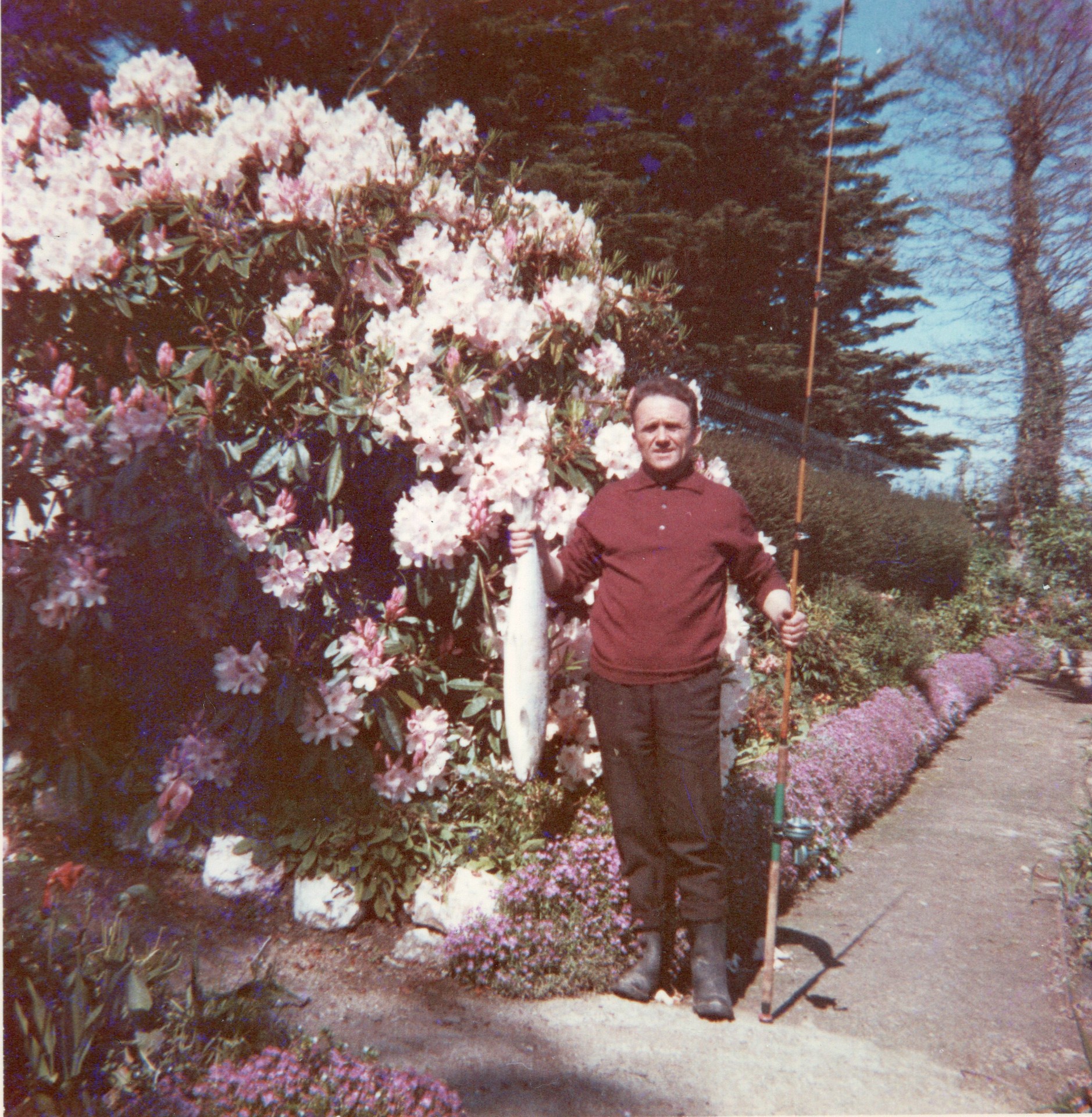 En remerciement d'un service rendu au printemps 1967, Le Goff vétérinaire offre à son cousin Pierrot Moreau la canne à pêche spéciale SAUMON. Le 15 mai qui suit, le saumon se faisant déjà plus rare dans l'Aulne canalisée, l'exploit se réalise. La prise est bonne. Pierrot pose pour la postérité.