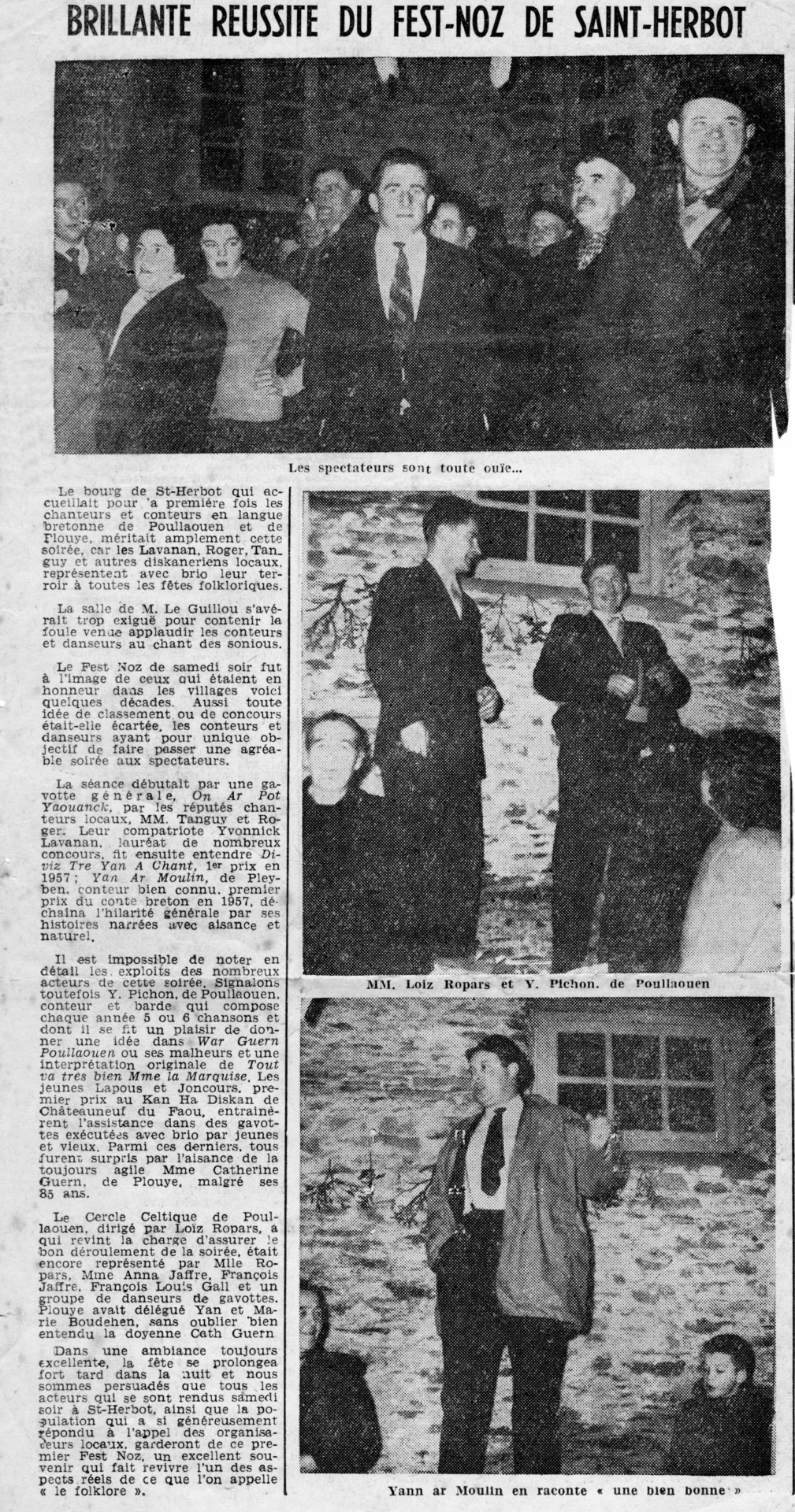 Extrait de l'article du journal : "Yann ar Moulin, de Pleyben, conteur bien connu, premier prix du conte breton en 1957, déchaîna l'hilarité générale par ses histoires narrées avec aisance et naturel"