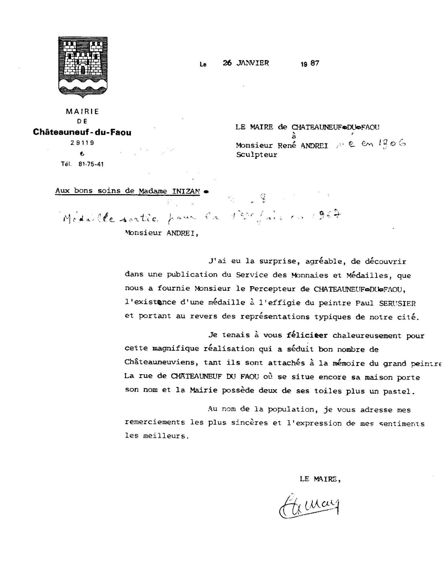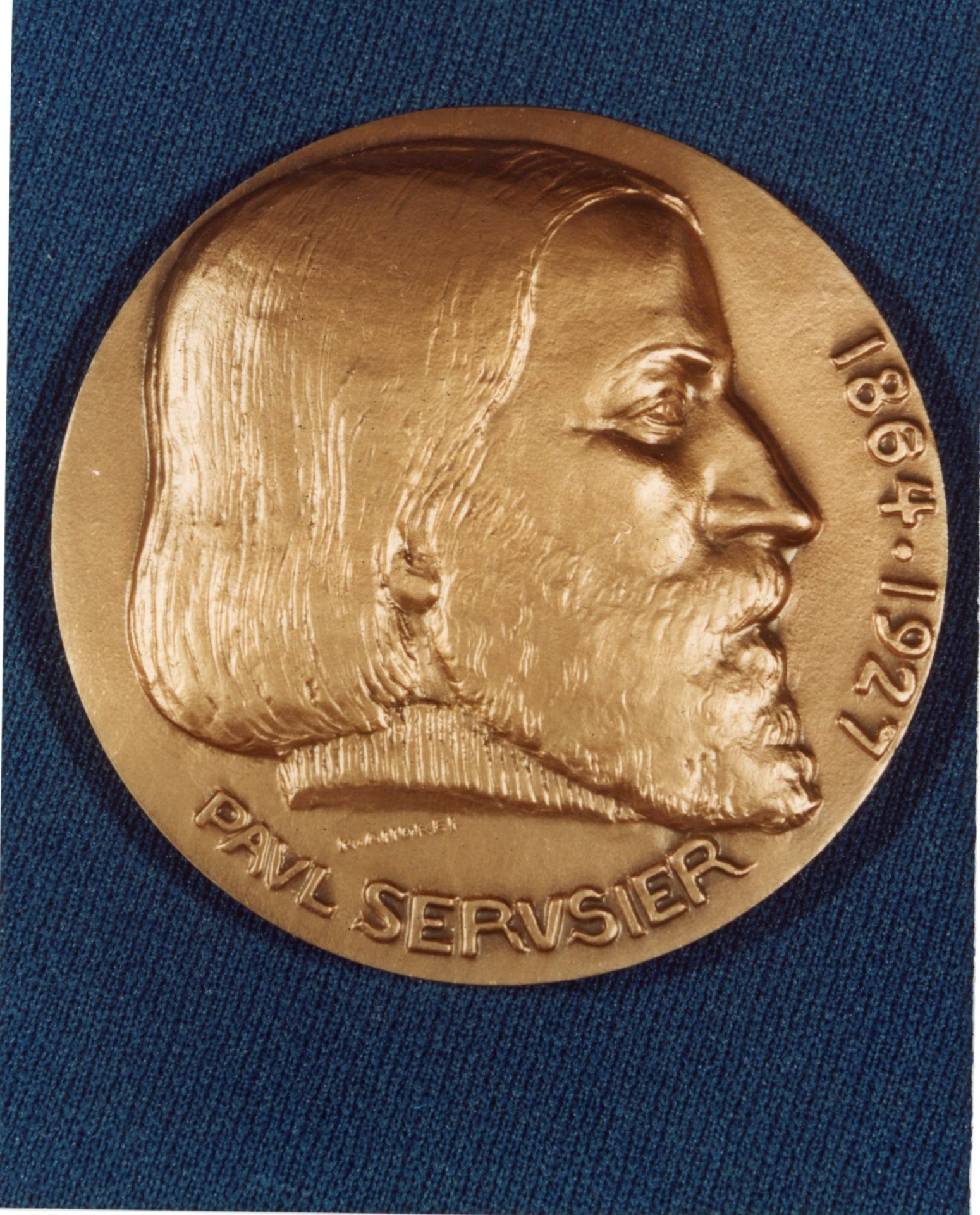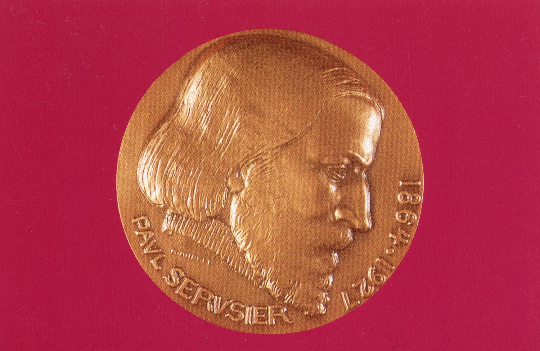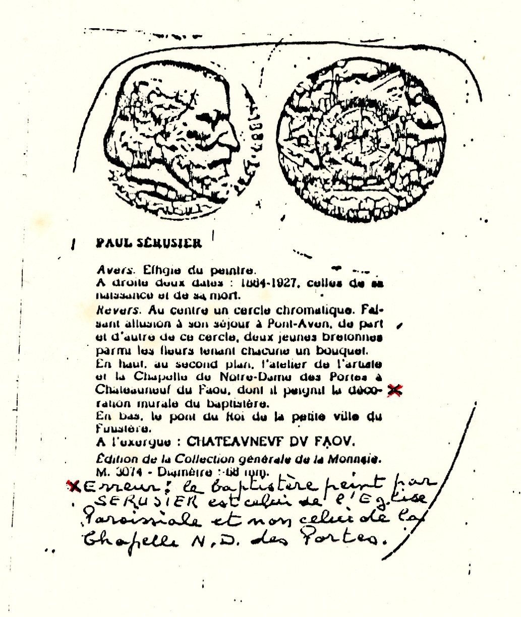 Revers : Au centre un cercle chromatique. Ffaisant allusion à son séjour à Pont-Aven, de part et d'autre de ce cercle, deux jeunes bretonnes parmi les fleurs tenant chacune un bouquet. En haut, au second plan, l'atelier de l'artiste et la chapelle de Notre dame des Portes. En bas, le pont du Roy de la petite ville du Finistère.